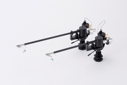 腕木状のアクリル製アームボードは、ターンテーブルのベース部に取りつける。搭載できるトーンアームは最大で3本。ここにも「3」という数字がキーワードとなる。アームベースは他社製用も存在するそうだが、試聴機には自社製のVIROAというヘッドシェル一体型トーンアームの12インチタイプと10インチタイプが搭載されていた。