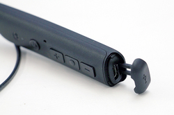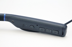 もちろん、耳周り首周り共に装着感は良好。リモコンボタンと充電端子はバンド左側に用意。ボタンは首を向く内側に設置されており、左手での操作なら人差し指や中指が、右手での操作なら親指が、どちらにしても無理なく届く。