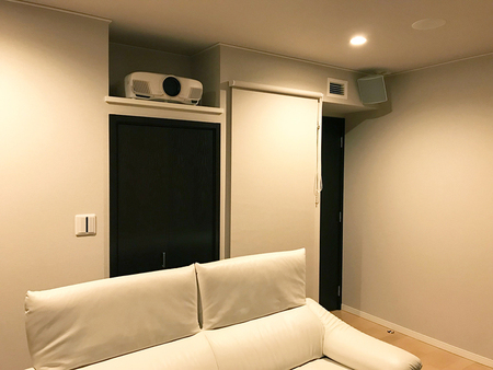 プロジェクターは4K、HDRに対応(*)しながらも比較的低コストで導入できるということから、EPSONの「EH-TW8300」を選びました。建築工事で専用の棚を作って貰い、隣接するウォークインクローゼットをえぐるような形で設置しました。部屋を将来的に寝室にすることを考えると、天井吊りの設置では天井を見上げたときに違和感があるように思えたためです。