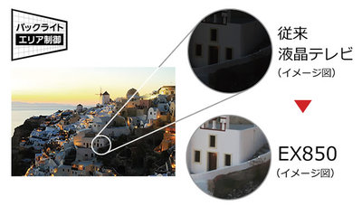 昼間、明るい日本のリビングも夜の映画鑑賞などのシーンでは、少し照明を落として100ルクス前後の環境での視聴も想定される。オールマイティーなコントラストのために採用したのがバックライトの「エリアコントラスト制御」だ。