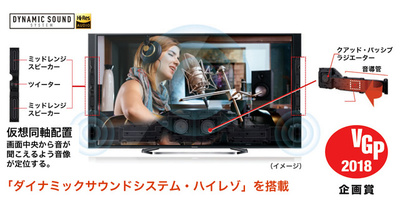 合計最大出力100Wの3WAYスピーカーシステムは、トゥイーター1基とミッドレンジスピーカー2基を仮想同軸配置とする正攻法。フルデジタルアンプ「JENO Engine」を搭載、放送ソースやパッケージのデジタル音声をビット拡張し高域信号を付加するなどハイレゾ・リマスター&アップコンバートし、中高域と低域それぞれに音量バランス調整、イコライズ、低音調整を行う。ミッドレンジはベゼル面積を無用に大きくしない楕円形状を採用、背面のウーファーは音導管が低音を前方に導く。