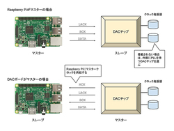 理由の1つは「マスターモード」のサポート。PCM5122は、I2Sのモードをマスターとスレーブに切り替えることができるのだ。I2Cで通信するなどしてPCM5122をマスターに(Raspberry Piをスレーブに)設定すると、入力したクロック発振器の信号をもとに生成したBCKとLRCKを合わせてRaspberry Piに供給、Raspberry Piはこれに同期する形でI2Sの「DATA」を送出できる。