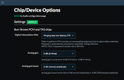 信号を送信するといっても手段はI2Cとなるため、所定の手続きを踏まなければならない。結局のところ利用するシステム(Linuxディストリビューション)次第ではあるが、Raspbian派生のシステムはPCM5122用ドライバーがカーネルにビルトインされているため、それほど手間はかからない。特にMoode Audioの場合、PCM5122のオプションを設定するWEB UIが用意されているので、作業は一瞬で完了する。