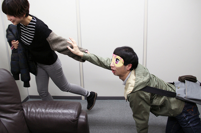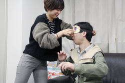 突然の話に戸惑う高橋氏を無理矢理連れ出そうと、深々と被った帽子を取り去りメガネを強奪。防御しようとする高橋氏の手を川田が振り払い、ひとまずアイマスクの装着に成功した。女性に乱暴に扱われるのが嬉しそうな高橋氏の様子はちょっと不安だが、とにかく準備完了だ。