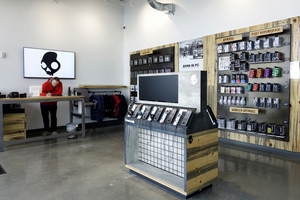 受付の隣には、小売店としても一般的に開放している専門ショップが設置されている。スカルキャンディーの店舗に設置する什器や新製品のパッケージングのテストも兼ねている。本社のショップを見ると、店舗のコンセプトがグローバルで統一展開できていることも頷ける。