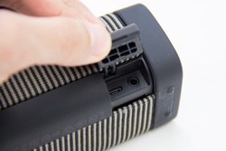 電源や音量ボタンは向かって右側面に用意。背面部のカバーを開けると、充電用USB端子、音声入力用のステレオミニ端子が用意されている。横置きで使うのが基本だが、縦置きでのリスニングも可能だ。ハンズフリー通話に加え、SiriやGoogle Nowにも対応したマイクも内蔵する。