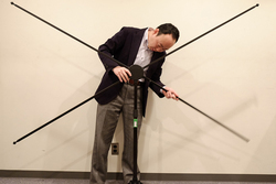 まずはスクリーンの組み立て。三脚部を開いて支柱を立て、幕面を支持する金属製の棒を、表示されている番号に従って挿入するだけと簡単だ。大きなX字の骨組みができたら、幕面の角に設けられた穴を、骨の先端に引っ掛けるだけ。骨の先端部はバネ仕掛けでになっているので、幕面はそのテンションでピンと張る構造。
