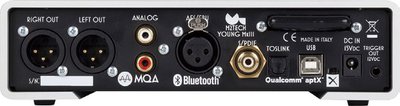【Young MkIII】●デジタル入力:AES/EBU(XLR)、S/PDIF(RCA 同軸デジタル、光TOS)、USB(B タイプ)、Bluetooth ●アナログ入力:RCA × 1 ●出力:XLR × 1(2 番ホット)※ XLR-RCA 変換プラグ付属●電源入力端子:5.5/2.1mm(センタープラス)●出力電圧(0dBFS 時):2.7Vrms(RCA 変換アダプター使用時“nomal”)、5.4Vrms(RCA 変換アダプター使用時“high”)、5.4 Vrms(XLR“normal”)、10.8Vrms(XLR“high”)●出力インピーダンス:100 Ω(RCA 変換アダプター使用時)、200 Ω(XLR)● S/N(0dB FS 時):120dB(XLR、A 補正)、116dB(RCA 変換アダプター使用時、A 補正)● THD+N(− 3dB FS、1kHz 時):0.0008%(XLR、0.003%、RCA 変換アダプター使用時)●対応サンプリングレート:PCM → 44.1/48/88.2/96/176.4/192/352.8/384Hz(352.8kHz 以上はUSB 入力のみ対応)、DSD → 2.8/5.6/11.2MHz(いずれもUSB 入力のみ対応)●ビット数:16 〜24bit(USB 入力のみ16 〜32bit)●ボリューム調節:0 〜− 96dB(0.5dB ステップ)●ミュート:− 20dB ●バランスセッティング:± 6dB(1dB ステップ)●位相:0°180°●オートオフ機能:OFF、10 〜240 分(10 分刻みで調整可能)●電源電圧:15V DC 300mA ●消費電力:4.5VA ●外形寸法:200W × 50H × 200Dmm ●質量:2.0kg