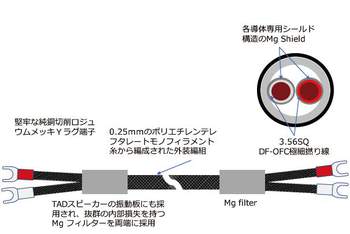 注目すべきことは、この導体(直径0.18mm極細銅線素材を140本ロープ撚り。3.6SQ)を耐熱PVCで絶縁し、その上に銅やアルミよりもノイズ遮蔽特性に優れ、TADの振動板にも使われる内部損失の高いマグネシウム合金箔を巻きつけていることだ(ホット/コールド独立)。これにより固有音を低減して、聴感上の静寂感、ダイナミックレンジの拡張を実現しているのである。