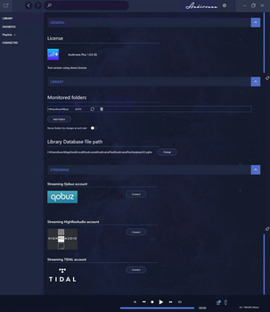 「GENERAL」はライセンス情報、「LIBRARY」は楽曲ファイルの参照先の指定、「STREAMING」はMac版同様にTIDAL、Qobuz、HiresAudioのストリーミングサービスのアカウントを登録できる。