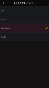 ミアのオーディションから始まるチャプター2では、セリフの聴きやすさを調整できるダイアログエンハンサーも試してみた。ダイアログエンハンサーは声の部分のみボリュームをアップしてくれるのだが、このシーンでは“Medium”のセッティングがマッチ。全体のボリューム大きめで視聴するなら“Low”でもバランスが取れるだろう。