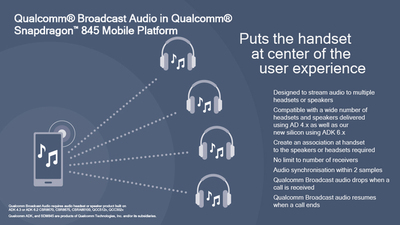 このほかにもSnapdragon 845シリーズには、Bluetoothに対応する複数のワイヤレスオーディオ機器へ同時に音声信号をストリーミングできる「ブロードキャストオーディオ」機能が搭載されている。現行のCSR8675シリーズでは、スマホからのストリームを受けた1台のマスターから、他のワイヤレスオーディオ機器へ信号をリレーする方法で同様の使い方を実現していた。相手方がQCC5100を組み込んだデバイスの場合、1台単位でスマートフォンとダイレクトにつながることになるので接続品質がさらに上がるはずだ。