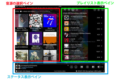 基本構成として、ネットワークプレーヤーの操作で大切な3つの要素、「音源の選択ペイン」「プレイリストペイン」「ステータス表示ペイン」が1つのウインドウ内に配置されている。それにより(1)音源を選択 → (2)プレイリストに追加 → (3)再生中の音源を確認する、という操作がスムーズに行える。