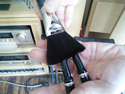 かくのごとく、非常に高い効果を発揮してくれる除電ブラシだが、この効力が及ぶ範囲はまだまだ広い。ここでデジタルプレーヤーとプリアンプをつなぐインターコネクトケーブルを、音楽を流しながらケーブルに添って掃いてみたら、もう掃いている最中から部屋へ響く音響が変わっていくのが分かって面白い。製品によって千差万別だが、ケーブルにも帯電しやすい素材は意外と使われていることが多く、除電が大きな効果を発揮することが多いものなのだ。