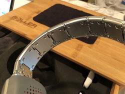 このヘッドバンド、写真のくるっと丸まっている状態がデフォルトというか、頭から外して手を離すと内蔵スプリングの力で自然とその状態になるのだ。つまり折りたたまなくても勝手に丸まってコンパクトになってくれる。またその勝手に丸まるテンション感と多くの可動部のおかげで頭部へのフィット感も良好。