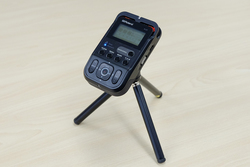 おかげで普通にテーブルの上などに置くだけで、例えば会議録音ならば人の口の高さに向かうように、マイクが適切な角度になる。またテーブル表面での音の反射の影響を受けにくくなり、そのことからの録音音質面での優位にもなる。加えて全体の大きさや形のおかげでグリップ感もよく、手に持って操作するときの使いやすさも良好だ。