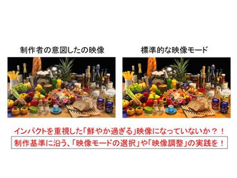 一方、家庭では、視聴場所の明るさや照明の色などもバラバラなので、視覚の順応機能(自動補正)が働き、テレビが規格通りに映像を映し出すと、相対的に見え方が変わってしまい、制作者の意図から外れてしまったり、見映えしない映像になってしまう場合がある。こうした環境による影響を補正する画作りは決して悪ではなく、むしろ家庭用テレビには必要だ。