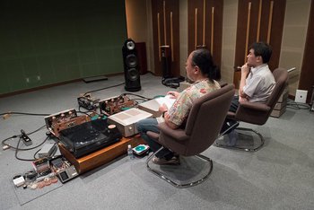 ではいよいよ「SA‐12」「PM‐12」の試聴。テクスチャーとしては10シリーズのペアときわめて近似。さすがに圧倒的な物量で支えられた重心の低さと安定感で同ペアが勝るが、クイックな反応、トランジェントのよさでは、12シリーズのペアも好印象だ。