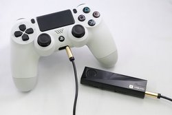 まずはPS4とXPUMPを接続してみました。接続手段はふたつあり、ひとつめはモニター(テレビ)側のイヤホンジャックと接続する方法。ふたつめはPS4のコントローラー(デュアルショック4)についているイヤホンジャックを使う方法です。どちらも効果的にはほとんど変わらず、接続の手間も変わりませんでした。けれど、デュアルショック4ならワイヤレスで使えるので、テレビから離れた場所でもXPUMPを繋げてヘッドホンやイヤホンが使えるので、便利な感じです。