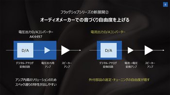 電流出力型では、いわゆるI-V変換回路からオーディオメーカーが担当するわけだが、その外付け部品や構成、チューニングによってブランドカラーを出しやすい。熟練した設計者であるほど、そのこだわりが反映できるのである。ただし使いこなしの点ではややハードルが高く、また電圧出力型に比べて外付けパーツが増えることから、コスト面でも不利といえるかもしれない。
