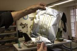 そう話しながらバラビオ氏は、薄い振動膜を手にする。振動膜そのものの重さはわずか0.005g。空気よりも軽いこの膜にプリントされたコイルの長さは、なんと長いもので3.8mにも及ぶそうだ。