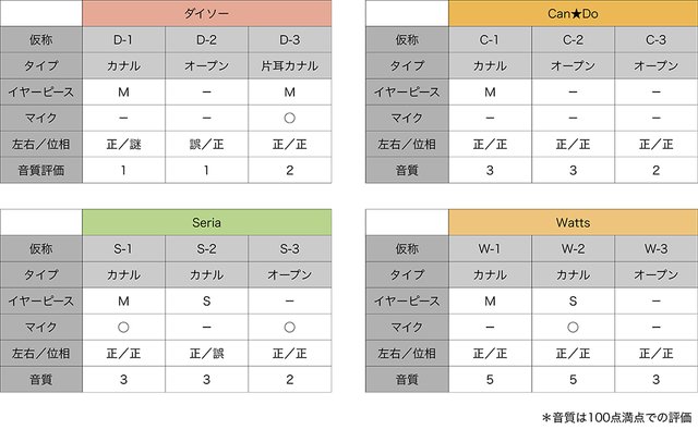 そんなこんなもありつつ、では「100均イヤホン選びはここがポイント!」というところも解説。まずは再びこちらのまとめ表を見ていただいて……