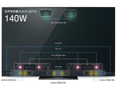 GZ2000は音響設計も規格外だ。内蔵スピーカーは合計140Wもの出力を誇る3・2chスピーカーシステムに、世界初(※2019年7月19日発売予定。民生用テレビにおいて)となるテレビ一体型イネーブルドスピーカーを内蔵。天井からの反射音によりドルビーアトモスの立体音響をリアルに再現する。サウンドはオーディオグレードのパーツを使用した“Tuned by Technics”がさらに進化。新たにTechnicsのオーディオ機器に使用されている“JENO Engine”を搭載している。