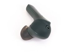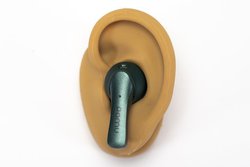 独自性のひとつめは、装着感へのこだわり。マイク部分をスティック形状に伸ばすというデザイン自体は珍しくないが、そのスティック部分も耳の凹凸に合わせた引っ掛かりとなることで装着の安定感を高めている。耳のくぼみに触れることになる本体の半分ほどは薄いシリコンキャップで覆われており、グリップも確保。試しにイヤーピースを外して装着してみても耳にしっかりと固定され、本体だけで十分な装着安定性を確保できていることが分かった。