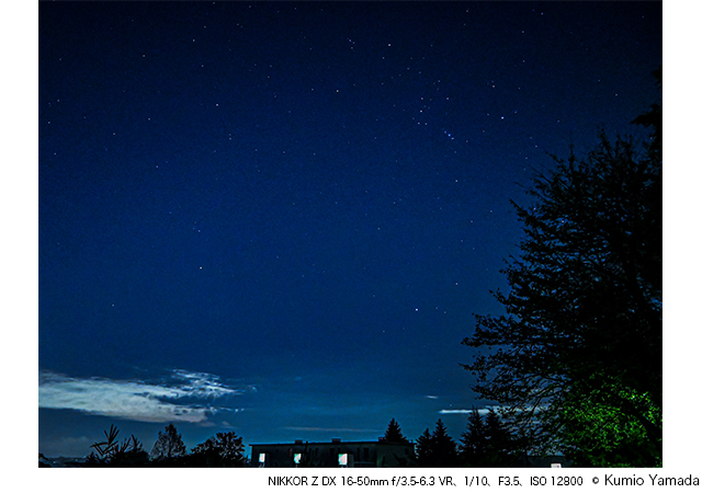 標準ズーム「NIKKOR Z DX 16-50mm f/3.5-6.3 VR」のレンズ内手ブレ補正の効果を試すべく、星空を手持ち撮影。シャッタースピードは1/10秒だが、優秀なレンズ内手ブレ補正により、ブラさずに撮影することができた。