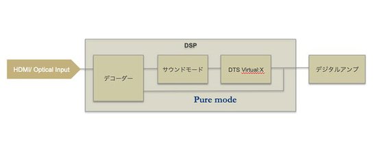 Pureモードを有効化すると、入力された音声信号はデコード後、アンプ段へ直接伝送される。デコード後のサラウンド処理・ヴァーチャル音声技術の処理をバイパスするため、音の純度がもっとも高まるという。Pureモードを基準に音決めするということは、すなわちステレオ/2ch再生がDHT-S216という製品の骨格であり、テレビや映画の音はその肉付けという考え方だ。