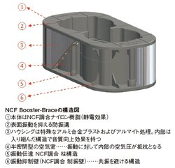 「NCF Booster-Signal-L」は従来のモデル「NCF Booster-Signal」のベースプレートを薄手仕様にしたもので、より低い場所にあるコネクターやケーブルにも使用できる。構造的には金属製のベースプレートに2本の金属棒がマウントされており、ここにNCFを主素材とするヘッドユニットを取りつける。NCFは樹脂系の素材なのでヘッドユニット自体はさほど重量があるわけではないが、中空構造を巧みにダンプしているようで、制振効果に加えて静電気除去効果も期待できる。