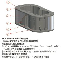 ホルダー内側はコネクター形状に沿ってくり抜かれ、表面振動を抑えるための防振溝が掘られている。さらに、本体自体は振動に対して内部の空気圧が抵抗となるよう、半密閉構造の空気室となっている。その内部には、NCF調合素材による柱や壁が複雑に配置されており、緻密かつ入念な設計思想によってこのNCF Booster-Braceが構築されていることが理解できる。本体裏側には強力な粘着テープが貼りつけられ、コンセントに接着できるようにもなっている。