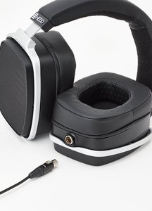 ケーブルは左右両出しでミニXLRコネクターによる着脱式。イヤーパッドは厚みがあり、レザー素材による肌触りのよい仕上げを用いている。