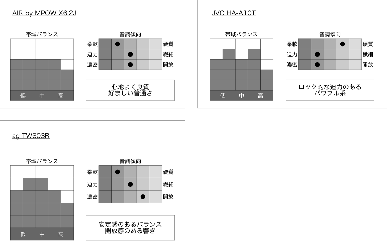 最後に各モデルの音質をさくっと比較。ついでにケースの雰囲気や大きさも並べて比較してみた。
