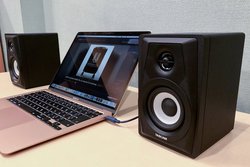 前述のようにサイズは十分に小さく、ノートパソコンの両サイドに置くと、スピーカーだぜ! という十分な存在感は発揮しつつ、画面サイズを圧倒して映像とのバランスを崩してしまうほどにはならない。13 - 14インチの画面と高さがだいたい揃う感じだ。