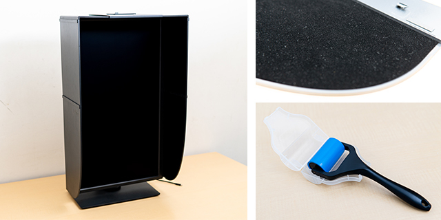 モニターフードに頼らずとも画面反射の少ない本機だが、通常はオプション扱いが多いモニターフードも同梱。縦向き設置にも対応する(左)、フード内部は反射防止の起毛処理まで施されている(右上)、画面の汚れを取り除くメンテナンス用のローラーも付属する(右下)