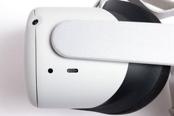 Questとの違い細かく挙げると、Quest 2ではUSB Type-C端子が移動して端子が横向きになった。イヤホンジャックは左右2つ搭載していたものが、正面右側の1つに削減。そして下部はボリュームのみとなり、QuestにあったIPD(瞳孔間距離)のスライド調整がなくなっている。