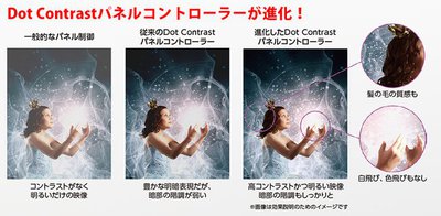 有機ELパネルは画素単位での輝度・色情報制御をその要諦とするが、HZ1800では独自技術「Dot Contrastパネルコントローラー」で光と色を分離してパネルを制御、高コントラストと色再現性の忠実度アップを図る。
