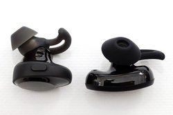 従来モデルのSoundSport Freeは、ノズル先端からハウジング外側までの寸法が長いイヤホンなので、耳に装着すると顔の左右に飛び出て見える。一方でQuietComfort Earbudsは、こめかみにより近くフィットし、顎のラインに沿って前方向へ緩やかにカーブするデザインなので、イヤホンが目立たないところがいい。ハウジングの裏側がこめかみのラインに密着するので、激しく体を動かしても、耳元で安定したまま動かない。