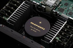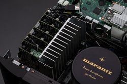 このトロイダルトランスを挟み、フルディスクリート11chのパワーアンプ部が左右5/6基に分かれヒートシンクにマウントされる。全ch同一クオリティ、6Ωで250Wを発生する。同じD&Mグループのデノンのモノリスコンストラクションとコンセプトは共通するが、大もとのトランジスタが違い、それぞれのサウンドマネージャーがフィルムコンデンサー等使用部品を独自に選び、回路設計も異にする。そのうえ独立したチューニングが施され、マランツ、デノンそれぞれの音質が生まれている。