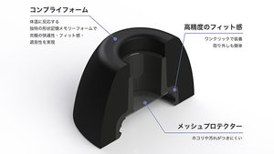 その一番の特徴は、温められるとさらに柔らかくなる独自の低反発ポリウレタン素材を採用していること。このおかげで耳穴の形にあわせて伸び縮みするので、口を動かしたり激しく運動しても常に優しく、それでいてしっかりとフィットし続けてくれる。