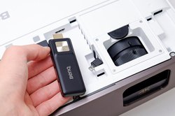 Android TV対応は、付属のドングルで実現される。本体上部の空間にHDMIポートと電力供給用のMicro USBを配置、そこにドングルを挿し込むという形だ。近頃プロジェクターにFire TV Stickなどの小型ストリーミングデバイスを接続するという視聴スタイルが流行りつつあるが、別売かどうかには大きな違いがある。