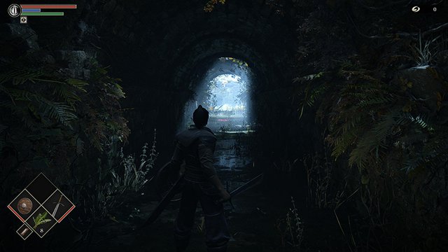 まばゆい光を放つ裂け目に身を投じると、そこは草木に侵食された陰鬱な水路。通常であれば何事もなく通り抜けてしまうシーンとは思うが、この時点で環境音の豊かさは圧巻である。狭い通路内をうごめく空気の動き、水の流れ、さらに小さな虫の飛び交う様までが精緻に音で表現され、尋常ならざる臨場感を生んでいる。
