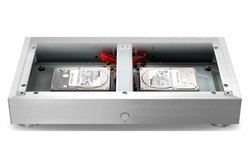 2.5インチのハードディスクは3.5インチと比べ消費電力が低く制御の電圧変動が少ないというメリットがあり、制御回路におけるノイズが抑えることができる。3.5インチハードディスクに比べ、質量が小さいため回転時に発生する振動が少ないのもアドバンテージだ。また2台のハードディスクを左右対称に配置する新レイアウト「水平対向マウント」を採用。これは、ヘッドのシーク動作による慣性力を打ち消しあうことで、振動を低減することができる(ミラーリングまたはストライピング運用時)。