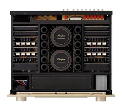 搭載回路と音質を支える左右独立の電源部ですが、トロイダル・トランスを2基、同社カスタムメイドのフィルターコンデンサー(10,000μF)を12式搭載し、十分に余裕のある高品位電源を構成しています。外観も内部も左右シンメトリーで、高品位な美しさを感じますね。
