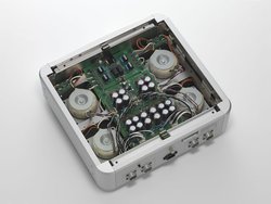なお、同社のトロイダル・トランスは、回路の消費電力に対しては、オーバースペックと言えるほど大型で、音質を重視するために金属カバーなどに封入させないとのこと。平滑コンデンサーには同社カスタムメイドのニチコン製を採用し、アナログ段の±電源には音質を極めたスーパー・キャパシターEDLC等を採用している。さらに筐体構造にもこだわり、重量級肉厚アルミパネルを使用し、徹底した振動対策と高音質化を行うと同時に、トランスと、その他基盤を別に配置するデュアル・レイヤー構造を採用している。