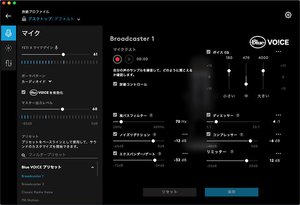 まずは音質のカスタマイズから。Yeti Xは同ブランドのUSBマイクとしては初めて搭載されるという、独自の音質調整機能「Blue VO!CE」に対応している。画像を見てもらえればわかる通り、ボイスEQの帯域ごとの調整に始まり、フィルターやコンプレッサーなど、まるで音楽制作ソフトウェアさながらの細かな設定が可能となっている。画面中央の「マイクテスト」からいつでも音声の録音/再生が可能なので、設定したEQを都度試すこともできるようになっている。