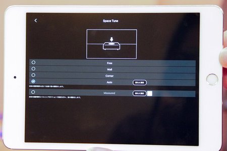 あわせて、本機の特徴の一つとも言えるのが「Space Tune」機能だ。開けた場所に設置するときは「Free」、壁際に設置するときは「Wall」、部屋の角などに設置するときは「Corner」と3つのプリセットが内蔵されるほか、本機では新たに内蔵マイクを用いて音場を計測し、自動で置き場所に応じた音質調整をしてくれる「Auto」モードに対応している。