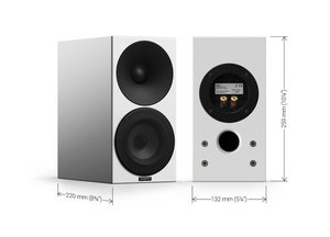 「Argon」はAmphion製品の中で、サラウンドにも対応できるバリエーションをラインナップした上位シリーズ。最もコンパクトなArgon0は、幅132mm × 奥行220mm × 高さ259mmと場所を取らず、フットプリントはほぼA5用紙サイズ。テレビ脇に並べるとちょうど良い雰囲気だ。