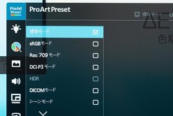 映像モードは初期設定の「標準モード」のほかに「sRGB」「Rec.709」「DCI-P3」「HDR(ここからさらに3モードに分かれる)」などを用意。本製品の画質ポテンシャルを「標準モード」で確かめてみると、画面全体が明るく、ハーフグレアながら色純度の高さが感じられ、解像度をストレートに出す。ドットの色滲みもなく、視認性は優秀だ。クリエイティブ用途向けの設計だけに、忠実な再現性能を有している。